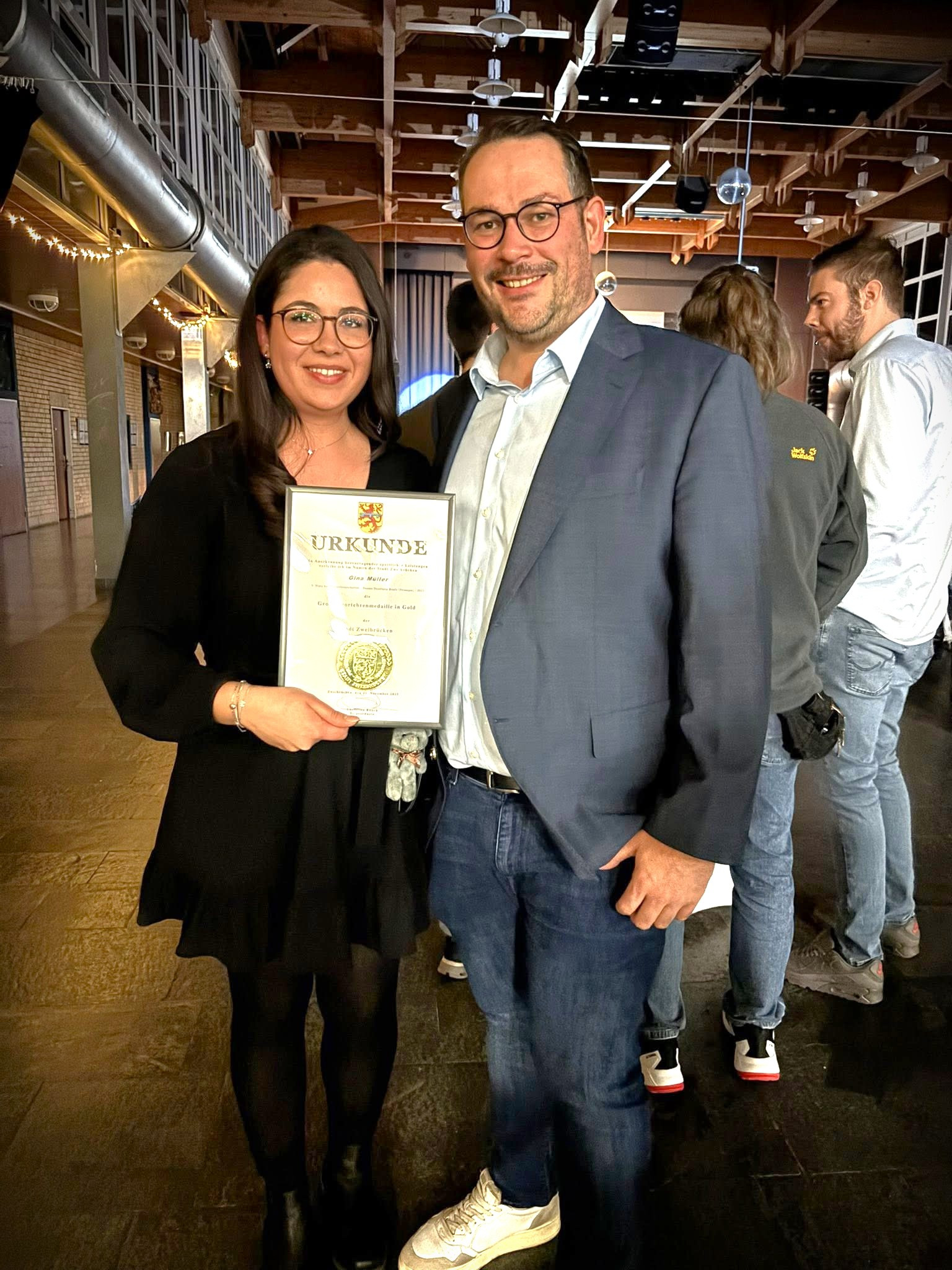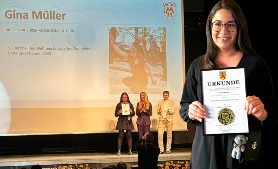 Gina Müller erhielt am 21.11.2025 die Große Sportehrenmedaille in Gold der Stadt Zweibrücken für ihre erfolgreiche Teilnahme bei der WM in Rom.